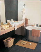黑色酷而時髦,是經(jīng)典的風(fēng)格。用黑色給都市男人定性是約定俗成的。所以為他們打造的浴室也自然是黑色的。從洗漱套件到地毯、熏香燈都一絲不差地選用黑色,連男士專用的香水沐浴露都是用黑色來包裝的。如果覺得色彩太單一的話,可以用白色、灰色來調(diào)劑一下,就算是一枝簡單的馬蹄蓮也可以起到特別的效果。