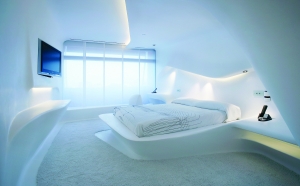 純白臥室 這是由著名女建筑師ZAHA設(shè)計(jì)的室內(nèi)項(xiàng)目,盡管以白色作為主色調(diào),但卻絲毫感覺不到簡(jiǎn)陋。設(shè)計(jì)師巧妙地用各種曲線來突出白色的質(zhì)感,從某個(gè)角度上說,這是徹底的“裸”。