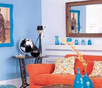 將橙色與綠松石色進(jìn)行大膽的搭配,可以呈現(xiàn)出一種令人震撼的視覺(jué)效果。橙色的大沙發(fā)強(qiáng)調(diào)了整個(gè)空間的主體色調(diào),沙發(fā)上圖案簡(jiǎn)單的花卉靠墊與橙色主調(diào)形成一種呼應(yīng)。泛白的綠松石色裝飾墻,延伸出另一種風(fēng)格的空間。薄紗窗簾使室內(nèi)的光線更加自然柔和,帶有戶外咖啡座風(fēng)格的藤條茶幾和扶手椅,讓人很自然地感覺(jué)到悠閑與愜意。碰上好的天氣,可以很方便地將他們搬到陽(yáng)臺(tái)上。鐵藝小桌上穩(wěn)固的大號(hào)蠟燭臺(tái)和漂亮的古典式燈籠可以非常方便地為室內(nèi)或室外提供照明。
