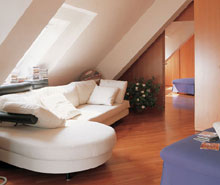 閣樓雖然看似復(fù)雜難用,卻有它與生俱來的優(yōu)點(diǎn)。閣樓空間豐富,富有趣味和變化;閣樓平均層高低,因此更使人感覺親切、溫暖,富有安全感;閣樓是神秘的,天然的斜面使室內(nèi)的光影變幻萬(wàn)千;閣樓是最高的,有最開闊的視野、最新鮮的空氣;閣樓也是最貼近藍(lán)天的,躺在出自大師Antonio Citterio之手的白色沙發(fā)上,透過屋面的斜窗,感受一下“日看白云夜看星”的生活吧!也許我們還可以想得更遠(yuǎn)一些,想到童話中閣樓里的精靈,想到閣樓里的公主終于見到了白馬王子,想到巴黎圣母院閣樓里的愛情故事……為什么它們總是發(fā)生在閣樓里?因?yàn)殚w樓意味著溫暖和浪漫。