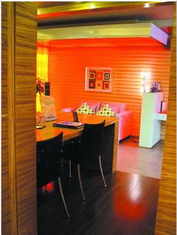 ?。坌菹^(qū)]在用餐區(qū)里品一杯香濃的牛奶時,是否開始有點困意了?臥室的墻面被打掉了,取代以一面全透明的玻璃墻,與餐廳相連的部分,拉上了一層淺淺的白紗簾子,輕輕碰一下,簾子就會微微的顫動,隱約看得見臥室里散發(fā)出來的絢麗夢境。為了帶出一種和諧生動的意境,設(shè)計師為臥室選擇了橙色系列的鮮艷基調(diào)。白色橡木床和地柜配上淺米黃的墻身顏色,加上夸張的橙白被褥和靠墊,床邊還有設(shè)計師獨愛的造型獨特的橙色搖搖椅。不一定繁雜的設(shè)計和擺設(shè)才是美麗,這里就有平常感觸不到的心動。