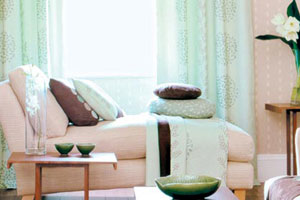 手法:米黃色沙發(fā)、壁紙&果綠色抽象圖案靠墊、窗簾