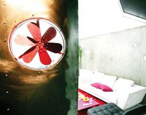 靳喜歡設計風格強烈的空間。受國際前衛(wèi)想法影響,未來感十足的裝飾風格被采用。用略帶透明的亞克力材質來裝飾天花板和墻壁,里面放置的燈管讓整個空間立刻充滿外太空似的未來氣氛。廢棄的暖氣管子被做成了茶幾,厚重的鋼板被制作成玄關,墻面都露出了粗糙的水泥,讓整個空間充斥著硬朗的感覺。在通過掛著不少干花的紗簾之后,不論是色彩還是燈光,浪漫而曖昧的情調應運而生。于是,在這個空間里,既擁有了硬朗風格,又有了浪漫情調。