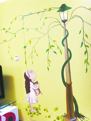 目前人們比較喜歡家庭中的繪畫藝術(shù),各種噴繪、手繪的圖案在家居中盛行。而繪畫也常常被應(yīng)用在隱形門上,讓畫面掩蓋門。這個(gè)案例就是把墻和門做成一個(gè)整體,然后在整面墻上進(jìn)行繪畫,用畫的圖案把門隱藏在墻上,它的巧妙之處是利用畫中高高的燈柱,深色燈柱高而直,把門的一邊縫隙藏了起來,不細(xì)看就看不出門在哪里。