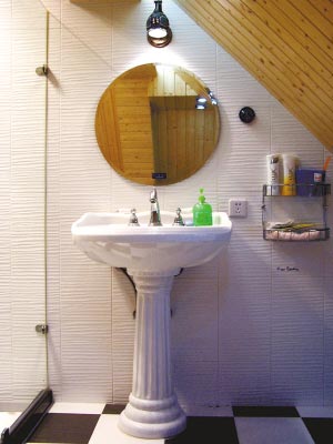 小衛(wèi)生間可以使用柱式盆以減少擁堵感,另外也要巧妙地增加儲(chǔ)物空間。 閣樓總?cè)菀妆蝗撕雎?,作為一個(gè)異型空間,這里常常被視為衛(wèi)浴空間“禁區(qū)”,因?yàn)椴粌H要解決屋頂?shù)南拗坪头莱钡葐?wèn)題,還需要在有限的空間里制造出合理的布局。在一個(gè)高矮不均勻的天花屋頂下,要滿足衛(wèi)浴空間內(nèi)的所有功能,需要巧妙的構(gòu)思。
