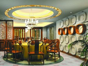 設計思路:這個餐廳以中式傳統(tǒng)的圓形為基本造型,吊頂和地面設計都突出了圓的主題,而在墻壁上,采用石膏線做出16個圓形的浮雕造型,在突出文化氛圍時又不墨守成規(guī),在中間一排的造型中又增加變化,營造出移步換景的裝飾效果。