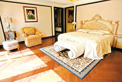 休閑區(qū)臨江而設(shè),透過整面落地窗能欣賞到珠江兩岸的美麗風(fēng)情。工作之余,坐在舒適的沙發(fā)上,享受一下浪漫的午后時(shí)光,泡上一壺英式紅茶,與愛人傾談,別有一番溫暖和甜蜜。西班牙Vidal Grau品牌的桌椅造型優(yōu)美,如果合在一起,即是一個(gè)玫瑰花杯型,如果再仔細(xì)看看,還能在椅子上看到玫瑰花的紋飾,華麗異常。