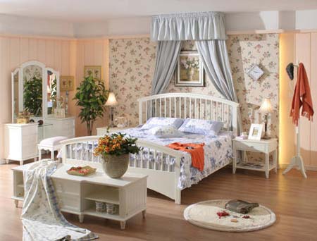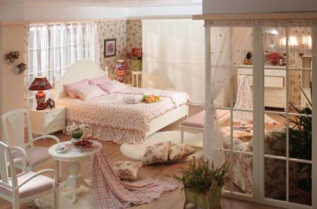 大量使用清新淡雅的顏色、柔美嬌嫩的花朵圖案,是使居室顯得更為浪漫的常用方法,這樣的床上用品多年來一直也是人們家居布置的首選參考方案。