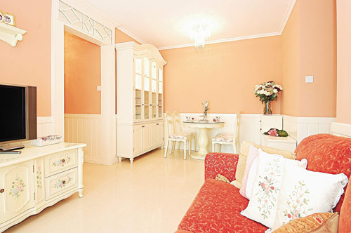 設(shè)計(jì)師透露,屋主為兩夫婦,看慣了舊居的白色布置環(huán)境,期望在新居注入新氣象??汀垙d堂分界鮮明,墻身上半部配用粉橙色,甚為奪目,下半則以條紋式設(shè)計(jì),為平實(shí)的墻身增添動(dòng)感一面??蛷d擺放了鮮紅色布沙發(fā),與一室散發(fā)的田園風(fēng)格甚為匹配。