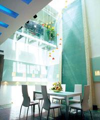 本案中,高達(dá)6米的水幕墻和簡約風(fēng)格的室內(nèi)設(shè)計巧妙地融合在一起,清泉一瀉而下,在餐桌的周圍靜靜地流淌,橘色的吊燈為素雅的房間平添了一種活力,這個水幕墻設(shè)計讓空間變得靈動而清新。