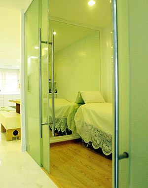 玻璃墻飾也是近來(lái)設(shè)計(jì)師喜歡用的裝飾手法,一來(lái)可以拉大房子的空間感,二來(lái)富于變化,常常給人驚喜。葉教授認(rèn)為,玻璃墻飾可以接受,但是有一個(gè)原則是不宜對(duì)床。此外,玻璃墻飾必須得靠實(shí)墻而置,不會(huì)令空間虛實(shí)不明。葉教授最后說(shuō),總之,家居中的玻璃裝飾不宜過(guò)多,具體如何運(yùn)用,不同的房間結(jié)構(gòu)則有不同的說(shuō)法。