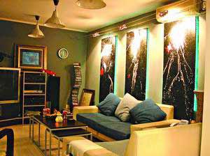 家庭公社點(diǎn)評(píng):在這個(gè)客廳的裝修中,墻面上的三幅版畫其實(shí)是用大芯板做的:把大芯板裁好后,刷上涂料,然后隨意打上一些膩?zhàn)?,如此一?lái),老客廳也風(fēng)情款款了。