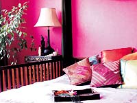 一說到泰國,頭腦中就閃出一個(gè)字“艷”。雖然家具是深栗色,但是泰式的裝飾品多是色澤極為艷麗的。金色、翠綠的紗幔,金色珠簾、真絲靠墊、粉紅的荷花蠟燭……有了這些,深色的家具反而更添香艷意味。