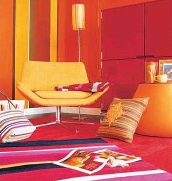 橙紅色:橙紅色令人想起秋天的果實(shí),所以這種色彩有很濃的大自然氣息,恰當(dāng)運(yùn)用會(huì)使居室有一種充滿活力的感覺(jué)。在清涼的初春選一塊橙紅色的窗簾,沙發(fā)上選兩塊橙紅色的靠墊,都不失為頗有靈性的選擇。