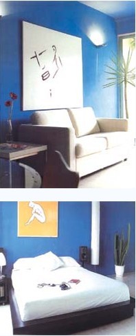 在起居室的那種生動的藍色設計,同樣在廚房里得到應用,充滿現(xiàn)代氣息的操作臺,固定在墻壁的一側。櫥柜選擇了深淺不同的藍色,為了避免顏色混淆,在臺面他選擇了高亮度不銹鋼來反射從墻面和天花板來的藍綠色。墻上掛的印象派藝術作品也是DavittChin的原創(chuàng)之作,只不過畫在普通的白帆布上,稍加裝飾而已。這種極簡風格的作品與藍色背景形成強烈的對比,同樣也反映出了他對于顏色搭配和平衡的天分。