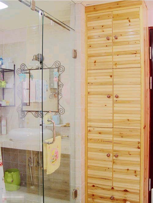 抽水馬桶的沖水槽上方是用廁時達不到的地方,我們可以利用此空間做一吊柜,深度約15厘米左右,才不致給人造成不便。柜內(nèi)可放置衛(wèi)生紙、手巾、洗潔劑、女性衛(wèi)生用品等,也可在下部做成開放式,放些綠色植物裝飾。