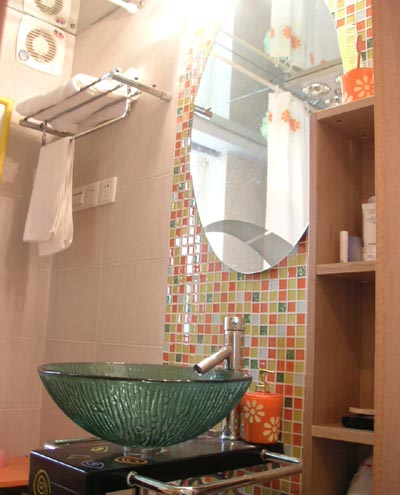 一般的衛(wèi)生間至少三平方米,可是這間卻只有2平米左右,原本里面放了一個(gè)淋浴房,后來把衛(wèi)生間向廚房里深進(jìn)了一點(diǎn),將浴房換成了浴缸, 最決的是頂面的處理,這里采用了全鏡貼面,因?yàn)閹膶痈咧挥袃擅姿?,確實(shí)矮了點(diǎn)兒,主人又喜歡亮堂,所以全貼了鏡子,增加了亮度不說,(而且讓滿足了女孩子的自戀癖)哈哈!墻面的玻璃馬賽克也是根據(jù)家居雜志的介紹,我自己選定顏色拼的顏色, 橙色的覺得暖和,一開門,一點(diǎn)燈,即使寒冬咱也覺得暖和??!