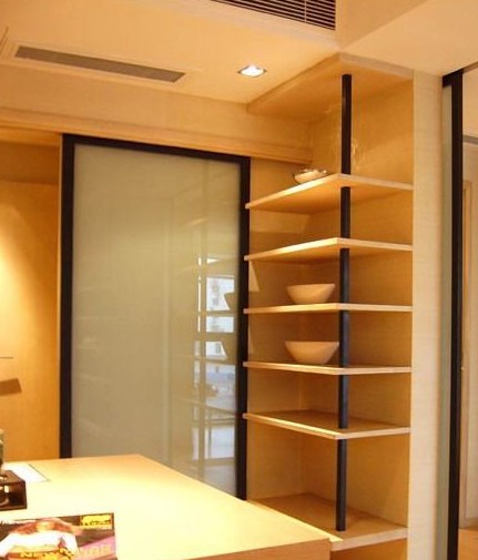 廚房形狀以開敞式為佳。櫥柜設(shè)計時應(yīng)注意操作臺的連續(xù)性,以便坐輪椅者可通過在臺面上滑動推移鍋碗等炊具餐具而方便操作減少危險。使用U形和L形櫥柜,便于輪椅轉(zhuǎn)彎,行徑距離短,使用雙列型櫥柜時,兩列間間距應(yīng)保證輪椅的旋轉(zhuǎn)。