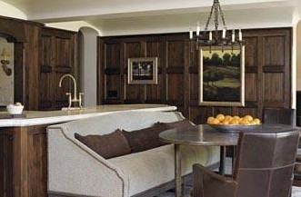 整個(gè)空間最引人矚目的是法國(guó)制作的鍍鋅餐桌,它在滿是實(shí)木的空間顯示出與眾不同的新鮮感。真皮包裹的座椅突出體現(xiàn)了美國(guó)西部風(fēng)味?;疑馁|(zhì)的布藝沙發(fā)用棕色線條勾勒出了靈動(dòng)的氣質(zhì)。實(shí)木櫥柜與整個(gè)空間相得益彰,白色的大理石臺(tái)面與銅制龍頭為深色空間增加了一抹尊貴的輝煌。
