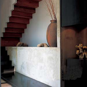 富于現(xiàn)代簡潔線條的樓梯給中式空間注入了時尚的節(jié)奏感,而留白手法的運用在新舊材質的對比中體現(xiàn)了一種婉約的美感。
