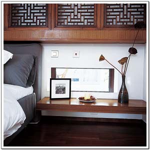 床頭兩邊開設(shè)的小窗戶是現(xiàn)代空間設(shè)計手法,并不具任何實用功能,因此這又是“借景”的傳統(tǒng)中式理念,獨具特色。