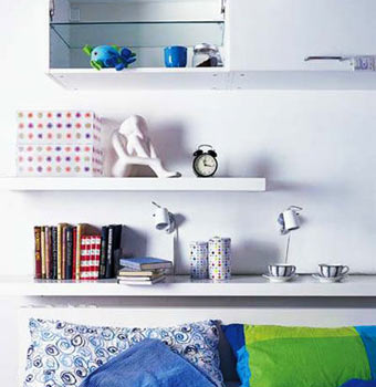和吊柜組合的擱架 打破傳統(tǒng)單一擱架的形式,和吊柜組合使用,可更多利用墻壁空間,同時(shí)也可使臥室里的一些私人物品被更好地隱藏起來。