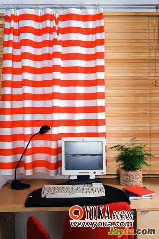 3.不同材質組合運用,不僅讓窗簾的形式更加豐富,也能更大程度發(fā)揮窗簾功效。書房的采光很重要,百葉簾便于調節(jié)書房內光線的強弱,但容易顯得單調,加上橙紅色條紋垂簾,讓墻上的色彩更加活躍。