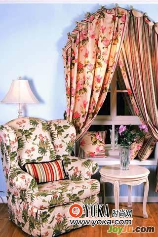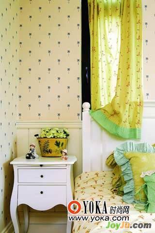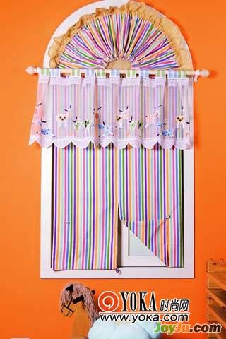 5.設計窗簾時要注意因勢利導、因人而異,根據窗戶的特點和使用者的性格特征來設計。此間兒童房的窗簾采用分體式設計。上半部圓弧形部分是用棉布做出自然褶度的異型窗簾,以魔術貼固定在窗框上,拆卸清洗均十分方便;下半部則是用彩色條紋棉布制成的卷簾,在卷簾下部開了個高叉,兩邊則配以紐扣和紐孔。這樣,即使卷簾放下的時候,也能很方便地把卷簾一角掀開,以紐扣在相應部分固定好,以獲取光線,符合兒童的需要。