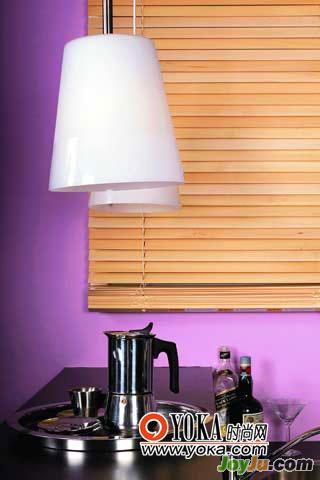 8.選擇窗簾的材質時,要視所在居室的功能而定。此處為廚房一角辟出來的一個小型吧臺,旁邊為洗手池,不遠即為灶臺,因此,選擇木質百葉作為窗簾。用原木木粉有機合成的簾片可以防水,不會霉變,而且防火阻燃,也不易變形。除此之外,適合在廚房應用的還有蜂巢簾,既隔熱,又防水。