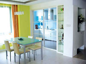 除了一些搞藝術(shù)的專(zhuān)業(yè)人士敢于在自己的家里大玩色彩游戲,絕大多數(shù)普通家庭都更傾向于采用簡(jiǎn)潔的風(fēng)格,究竟這樣的單色調(diào)不輕易讓人心生厭倦感。而這一次我卻看見(jiàn)好幾個(gè)完全不相干的顏色,在不同的房間里發(fā)揮著不同的視覺(jué)作用。右手邊的飯廳,墻面為淺淺的草綠色,搭配黃色條紋窗簾;而透過(guò)時(shí)下忽然變得很時(shí)髦的玻璃移門(mén),可以看見(jiàn)廚房里的墻壁上貼著淡藍(lán)色的瓷磚,都是冷色系的,但由于顏色調(diào)得很粉,所以顯得非常年輕。