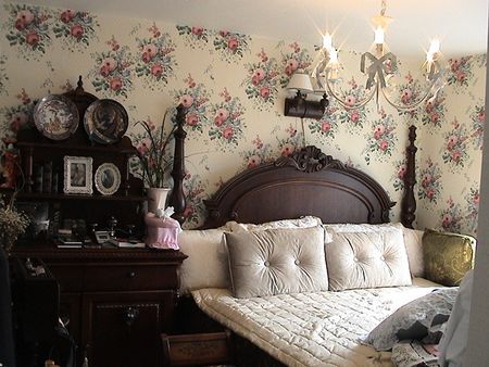 一般來(lái)說(shuō),臥室裝飾偏向于女主人的喜好,王女士是個(gè)干練的職業(yè)女性,居家裝飾也體現(xiàn)一種豪放與大氣。她家的臥室三面墻貼的是棕色有暗花的墻紙,床對(duì)面的北京墻是一整面墻那么大的百合花圖案?;ㄐ镜念伾c其它墻體顏色一致,整體感覺(jué)大氣浪漫,而又布滿藝術(shù)之感。