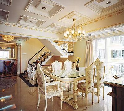 此風(fēng)格繼續(xù)了巴洛克風(fēng)格中豪華、動(dòng)感、多變的視覺(jué)效果,也吸取了洛可可風(fēng)格中唯美、律動(dòng)的細(xì)節(jié)處理元素。大至吊頂、衛(wèi)浴、樓梯隔欄,小至壁畫、燈具甚至一個(gè)鏡面都要有著歐洲古典風(fēng)味。
