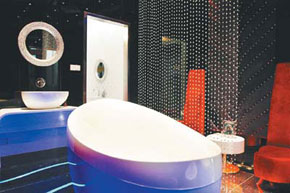 頭上是璀璨的斯華洛世奇水晶吊燈,腳邊環(huán)繞著范思哲的粉色瓷磚,眼前是造型纖巧圓潤(rùn)的唯寶潔具,舉手可以把玩福捷克產(chǎn)的鎦金玻璃花瓶;而變色龍式的酒紅落地幔紗,紅黃綠白紫七彩交錯(cuò),螺旋形水晶燈更將簡(jiǎn)單的浪漫單符彈奏成一首立體的幻想曲。這便是名家建材賣(mài)場(chǎng)里羅曼蒂克衛(wèi)浴套件營(yíng)造的奢華浪漫空間和氛圍。走進(jìn)這浪漫的氛圍,讓人不禁聯(lián)想起白居易的詩(shī):“春寒賜浴華清池,溫泉水滑洗凝脂”。