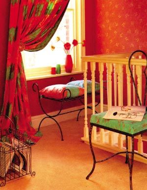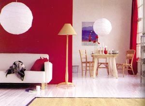 比如,一面白色的墻壁,可以作為以紅褐色與藍(lán)色為主色的現(xiàn)代繪畫的背景,相鄰的墻,飾以濃重的中國紅,與房間內(nèi)的藍(lán)色沙發(fā)形成鮮明的對比。一盞帶有土色燈罩的大燈在紅色的墻壁上勾勒出圓錐形的色塊。
