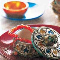 利用先在胡桃木上挖出凹槽,然后鑲嵌貝殼的傳統(tǒng)手工藝方法做成的八角木幾,上面擺放的托盤、玻璃杯和臺(tái)燈,都是典型的摩洛哥風(fēng)格。這一切與果敢而華麗的藝品搭配,營造出艷麗奪目的感覺。有著條紋圖案的金色靠墊,是用綢緞面料做成的。
