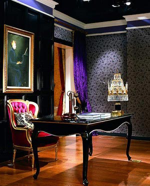 淺金顏色表現(xiàn)傳統(tǒng)的古典枝蔓花紋,壁紙的設(shè)計(jì)裝飾味道濃厚;大量的白色、米色、猩紅色讓居室布滿貴氣;閃亮面料的白色、金色條紋椅子是點(diǎn)睛之筆。