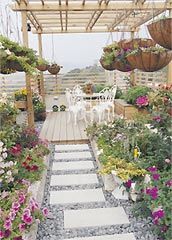 頂樓地面多為水泥地,感覺(jué)光禿禿的;露臺(tái)則多為磁磚材質(zhì),不用多加修飾。一般來(lái)說(shuō),要方便清理、維護(hù),最好盡量維持地面原貌,才能減少積水、臟污的機(jī)會(huì)。不過(guò)若真想擁有花園的整體感,倒是可利用拆組方便的鋪面材,如木板、石片,景觀用的小石子則不建議大面積鋪上。而墻面即使不掛盆栽,加上籬笆也能修飾整體景觀。
