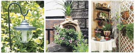花園里有了夜晚的照明,才能延長(zhǎng)你休憩的時(shí)間。假如你的頂樓原本就沒(méi)有安裝燈,又不想再接電線(有時(shí)電線在盆栽四周也有潮濕危險(xiǎn)),那不妨用方便安全的太陽(yáng)能戶(hù)外用燈,接滿(mǎn)太陽(yáng)能可照明6~8小時(shí),天氣不佳時(shí)白天可拿到室內(nèi)接受光源亦可。