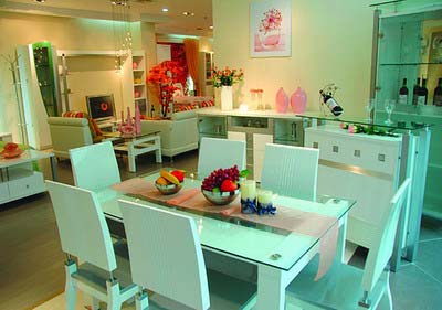 餐具配飾的選擇在白色家具的襯托下,粉紫色是非常迷人的色彩,能給人浪漫、溫馨的感覺,用來營造餐廳氣氛非常合適。餐桌上的配飾和餐具可以選擇比白色、粉紫色更明艷一些的玫紅色,以便更有對比層次。餐柜旁的鮮花架,增添了餐廳的浪漫柔和氣氛。