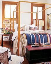 西部柔情 寬條紋的床罩和毛皮椅子是突出臥室風(fēng)格的裝飾品,簡(jiǎn)潔大方,花朵圖案的裝飾品和搭在床尾的毯子為臥室?guī)頊厝嶙匀坏娘L(fēng)情。利用織物的圖案與色彩賦予臥室剛?cè)嵯酀?jì)的視覺效果。