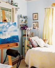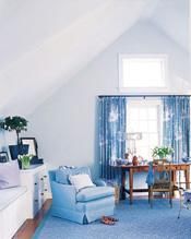最適合于夏日午后時(shí)光流連的舒適小床,簡(jiǎn)潔的鐵藝床頭富于美感,手感厚實(shí)暖和的白色床罩和窗簾,搭配淺藍(lán)色的墻壁和家具,氣氛寧靜。大小不同的靠墊有很好的裝飾效果。