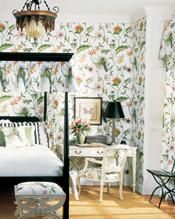 樹林之聲 紛繁富麗的墻布令人感覺仿佛走進(jìn)野花遍地的樹林,林中蕭蕭的樹葉聲中傳來清幽的鳥鳴,黑胡桃木的床好象就擺在樹林中,白色的床罩和黑白條紋的靠枕簡(jiǎn)潔而理性,與漂亮的墻布形成鮮明而生動(dòng)的對(duì)比。
