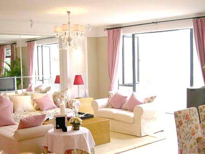 本案例采用英式田園風格中最常用的粉白為主色調(diào),整體感覺清新明媚,各種碎花布藝爭奇斗艷,空間活潑感極強。