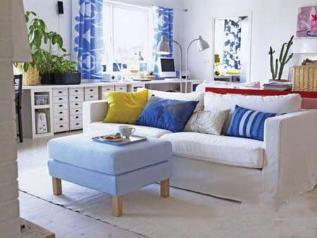 如果房屋空間給人以壓迫感,就可以選擇色彩強烈的豎條圖案的窗簾進行修飾,而且盡量不做簾頭??梢圆捎盟厣昂?,顯得簡單明快,能夠減少壓抑感。此外,可以使用升降簾。選擇橫向直線圖案的窗簾能讓房間“增肥”。另外,可以在狹長房間的兩端安裝帶有醒目圖案的布藝,一端是具有實用功能的窗簾,另一端則是裝飾簾,這樣前后呼應,也能產生縮短距離的效果。