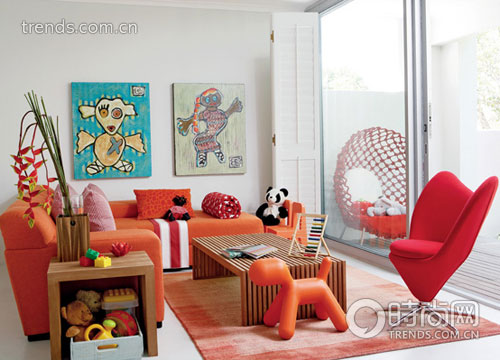 紅色跟橘色作為主調(diào)并不是很容易把握的,因為大面積此類顏色的使用容易使人感到煩躁,而這間客廳的搭配卻恰到好處。墻壁摒棄了花色的壁紙,保留純白的底色,只掛了兩幅充滿稚拙童趣的畫作,并以簡潔明快的天藍(lán)色打破視野中紅色占據(jù)的僵局。