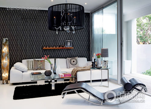 墻壁大面積使用黑底白紋的圖案,給地板留出足夠簡潔的空間。沙發(fā)上方做出的原木架將發(fā)散的目光重新聚集,照片擺在一側(cè),圓扁的小蠟燭悄悄亮起,讓氣氛一下活躍起來。水晶吊燈線條優(yōu)美,外面籠罩了一層黑色豎紋裝飾,與沙發(fā)前純黑的地毯遙遙相望,而躺椅完美的弧度在提供給主人充足的休息之余,也配合著前兩者成為屋內(nèi)最為深暗的色彩之一。橫排的白色沙發(fā)顯露出十足的貴族氣息,高高豎在一側(cè)的地?zé)粢蚕鄳?yīng)地做出漂亮的大花圖案,亮燈時花朵若隱若現(xiàn),朦朧之美呼之欲出。