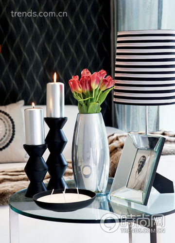 搭配黑白兩色,最佳伴侶無外乎金屬與玻璃材質(zhì)。茶幾是玻璃的,燭臺是金屬的,雖然摩登,卻不免冰冷。于是點燃蠟燭,紅色郁金香簇?fù)矶?,頓時讓人感到鮮活蓬勃的生機,主人的照片靜靜擺放在一旁,也讓房間多了一絲溫暖。