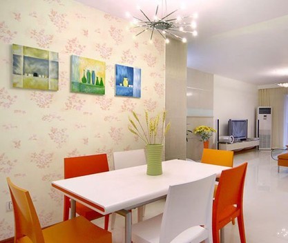 在色調上,地面采用深色地板以求穩(wěn)重,家具用和諧的暖色調,既高貴而又頗具休閑意味。純白的墻面給客廳一個純凈、明亮的背景,而燈光則以暖光為主。會客區(qū)的枝形吊燈和伸縮的就餐燈造型各異,富于變化,達到了形態(tài)上既隨意而又不混亂的效果。