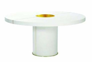 圓形桌面,圓柱形桌腿,雖然造型稱不上令人過目難忘,但純凈的白色還是會讓人感到單純的可愛。桌面中央的中空軸內(nèi)壁用金光熠熠的馬賽克進(jìn)行了裝飾,這種不顯山、不露水的低調(diào)華貴絕對是整個茶幾最讓人感到驚艷的地方。