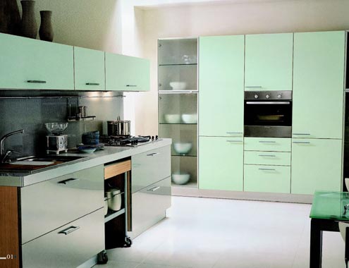 據(jù)資深櫥柜設(shè)計(jì)師介紹,功能強(qiáng)大的整體櫥柜在實(shí)際布置時(shí)常擺放成一字型、L型或U型。面積不大的廚房一字型較常采用,所有的工作區(qū)安排在一面墻上,節(jié)省空間。如果廚房比較寬敞,一字型的櫥柜最好拐個(gè)角變身L型,否則容易降低操作效率。U型的櫥柜有兩處轉(zhuǎn)角,空間要求最大,收藏也最豐富。